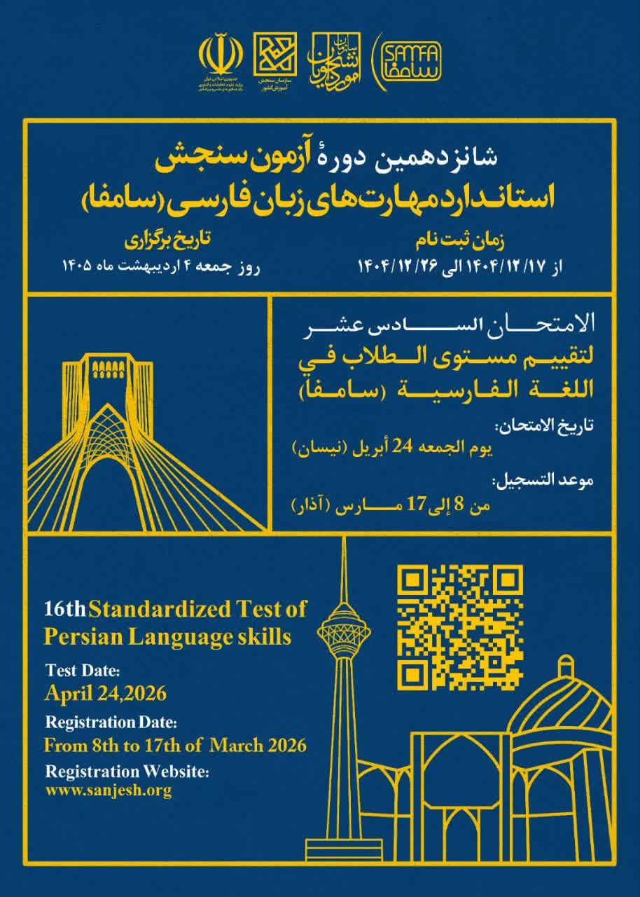 شانزدهمین دوره آموزش سنجش استانداردهای مهارت زبان فارسی (سامفا) در تاریخ 4 اردیبهشت ماه 1405 برگزار می‌گردد. مهلت ثبت نام برای شرکت در این دوره از تاریخ 17 لغایت 26 اسفند ماه 1404 می‌باشد.